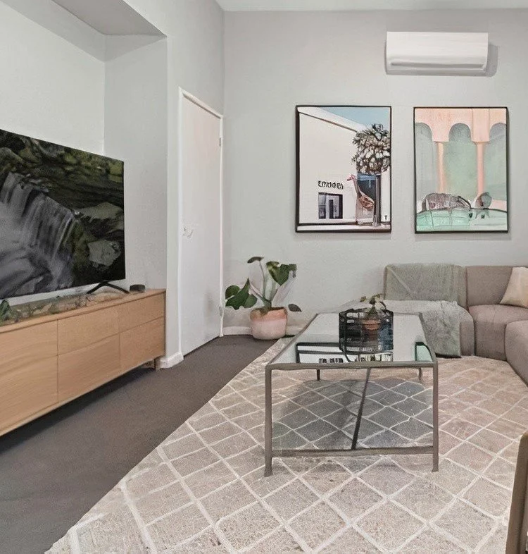 Amanda wanted suggestions and recommendations for a chaise, two tv units, coffee table, artworks, cushions, bar stools… plus layout and styling. She wasn’t sure if both spaces should have matching styles. Amanda and her partner were interested in incorporating Country Rustic, Modern and Boho styles their new design. They wanted both spaces to be stylish, inviting, comfy and functional - a place to watch movies, listen to vinyls, play guitar and relax with friends. She and her partner had a budget of $4,500 to $6,500 for furniture and decor.