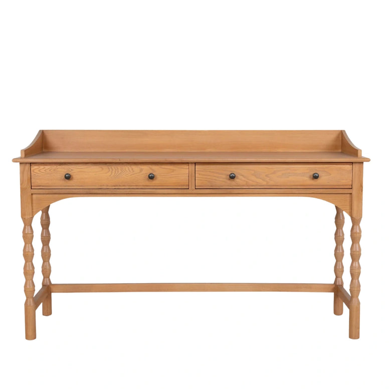 Crafted from solid ash wood with a natural veneer finish, this piece balances timeless craftsmanship with modern design. The Cameo has two compact drawers with elegant metal knobs, complemented by turned geometric legs for added character.