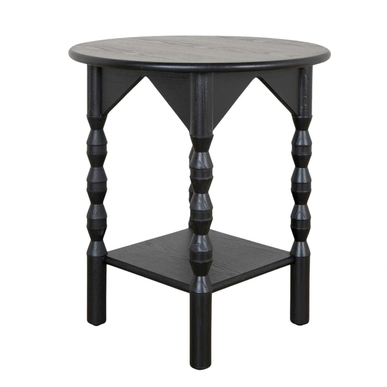 Crafted from solid ash wood with a smooth black finish, this piece balances timeless craftsmanship with modern design. The tabletop features a natural veneer surface, complemented by a sculpted lower shelf and turned geometric legs for added character. A central drawer with a round metallic knob offers discreet storage, while its fully assembled form ensures effortless styling from the moment it arrives.