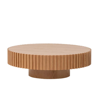 Our solid look coffee table has the looks, functionality and quality you need. The 110cm round top gives ample space for your everyday needs. This table features a natural veneer construction. The table’s aesthetic is a nod to contemporary design. Its well-thought-out design seamlessly merges with the conical base, creating a harmonious silhouette that enhances the visual appeal of your space. It’s a piece that complements a variety of styles and decor. Comes in natural and black.