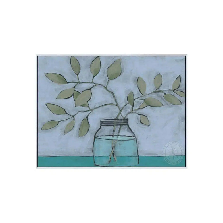 Perfect for contemporary spaces, this art piece effortlessly blends modern aesthetics with natural allure. Featuring a chic glass jar adorned with earthy green foliage, this artwork creates a refreshing and stylish focal point. Elevate your space with the perfect balance of sophistication and nature, as the interplay of colours and forms adds a touch of contemporary elegance to any room.