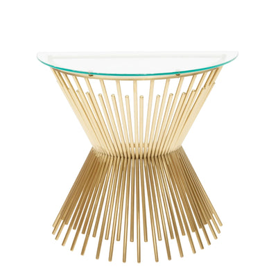 Our console table has a half-moon tempered glass top, ensuring lasting durability. Its strong metal base in a brushed gold finish adds elegance and charm. The starburst-like base design enhances the overall aesthetics, providing a touch of uniqueness. The warm gold hues beautifully contrast with the clear glass, making it a stunning addition to your interior. Check out our matching starburst coffee table.